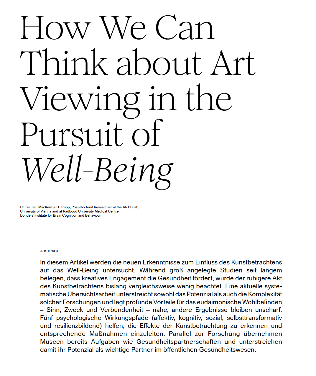 Fresh from defending her PhD “Examining the Impact of Art Viewing and Appreciation on Well-being” and newly featured in ICOM Magazine’s How We Can Think about Art Viewing in the Pursuit of Well-Being, MacKenzie Trupp invites us to reconsider a deceptively simple question: what actually happens to us when we look at art?